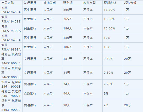 3月8日在售高收益银行理财产品:今日在售预期年化收益率在10%以上的银行人民币理财产品共5款。民生银行发行的“博赢FSLA19453A”预期年化收益率最高,为13.20%。